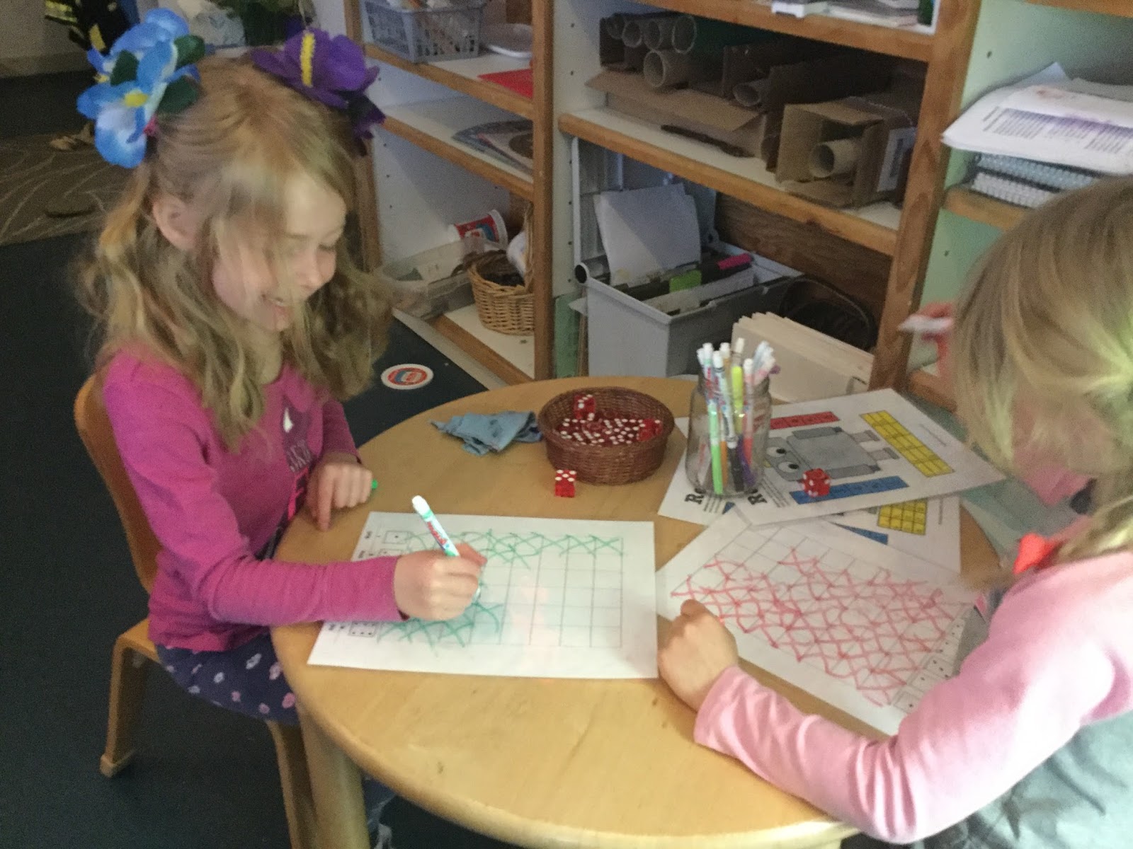 We enjoyed extended outdoor playtime on Monday and Friday, while midweek we worked with more focus in the classroom before our long outside times. An ongoing game of restaurant in the dramatic play area has involved most of the class at one time or another. Blocks are constantly in use and have been combined with cars to create nice cooperative play and occasional conflict, providing natural opportunities to work on social skills. Dice continue to be a popular tabletop material that lend themselves to a variety of games created by the children. CG is hoping to add more variety such as dice with larger numbers, letters, or more sides. Daily, we have been playing group games, which require following directions and taking turns in fun ways. Our favorite and most recommended book of the week is Sometimes I'm Bumbaloo, a great story about how a little girl feels when she loses her temper. Please send water bottles next week; it should be a hot one.